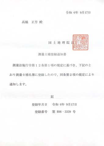 2024/10/01 測量士補 登録しました 測量士補とは、測量業者に従事して測量を行うために必要となる国家資格です。(ウイキペディアより) これからも、学習と修練を重ね、お客様のご要望にこれまで以上に応えたいと考えております。 tagPlaceholderカテゴリ: